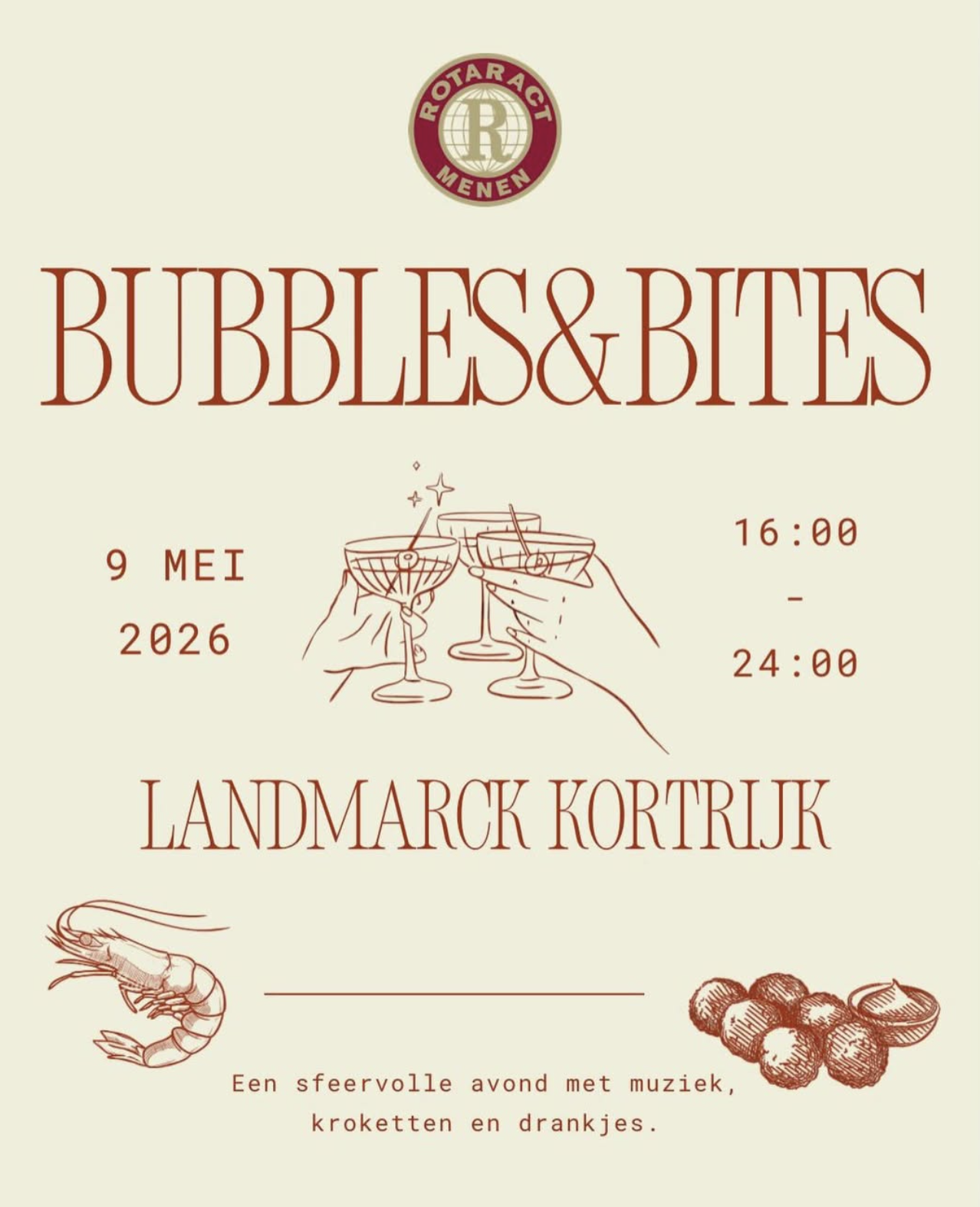 In mei 2024 organiseerden wij onze eerste editie Bubbles & Bites! Een gezellige apero in centrum Kortrijk waar iedereen kon genieten van een lekker glaasje bubbels of een smeuïge kroket. Het ideale concept op een zonnige zaterdag!